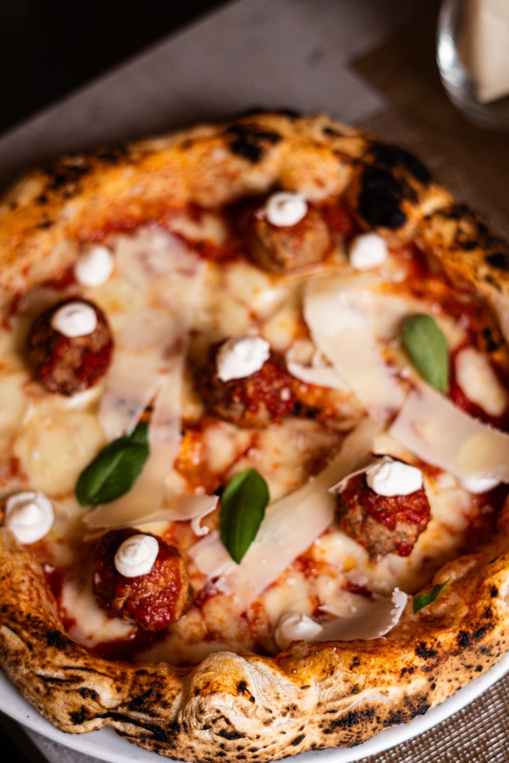 Sauce tomate, mozzarella fior di latte, ricotta di bufala, parmesan, boulettes de viandes, basilic, huile d’olive