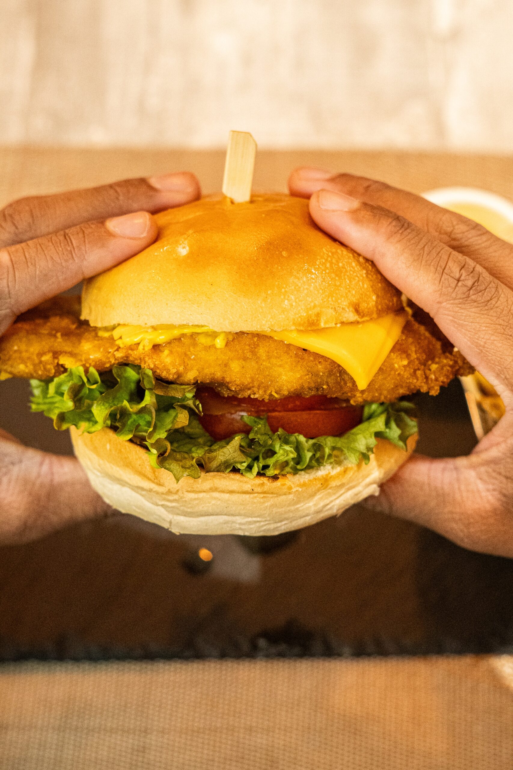 Pain artisanal, sauce curry, salade, tomate, filet de poulet crunchy, cheddar,