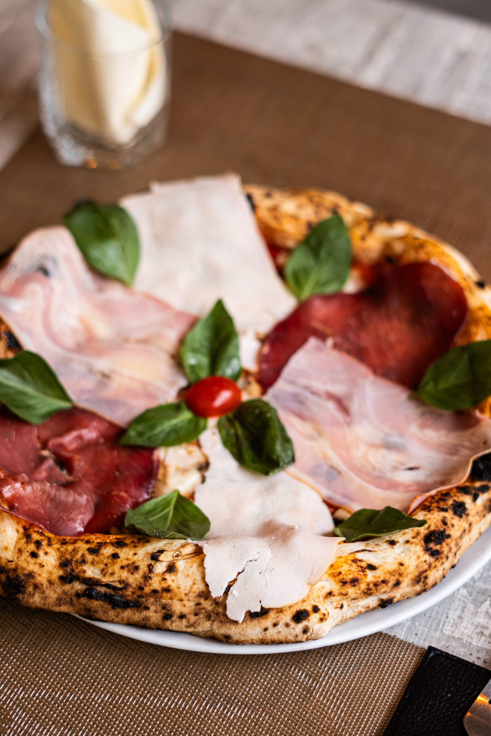 Sauce tomate, champignon, trois jambons (bresaola, pancetta, jambon poulet rôti),