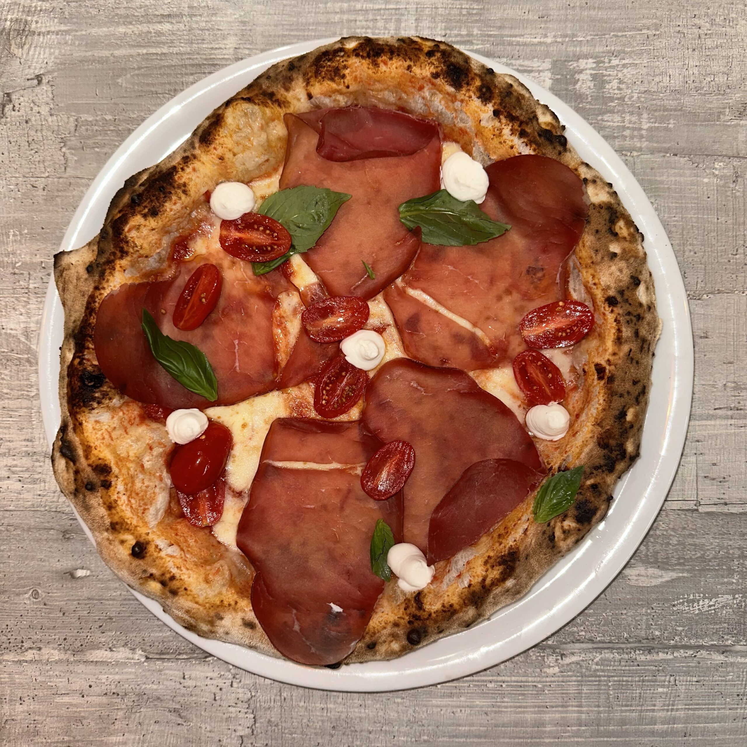 Sauce tomate, mozzarella fior di latte, fior di ricotta, jambon (bresaola), trio de