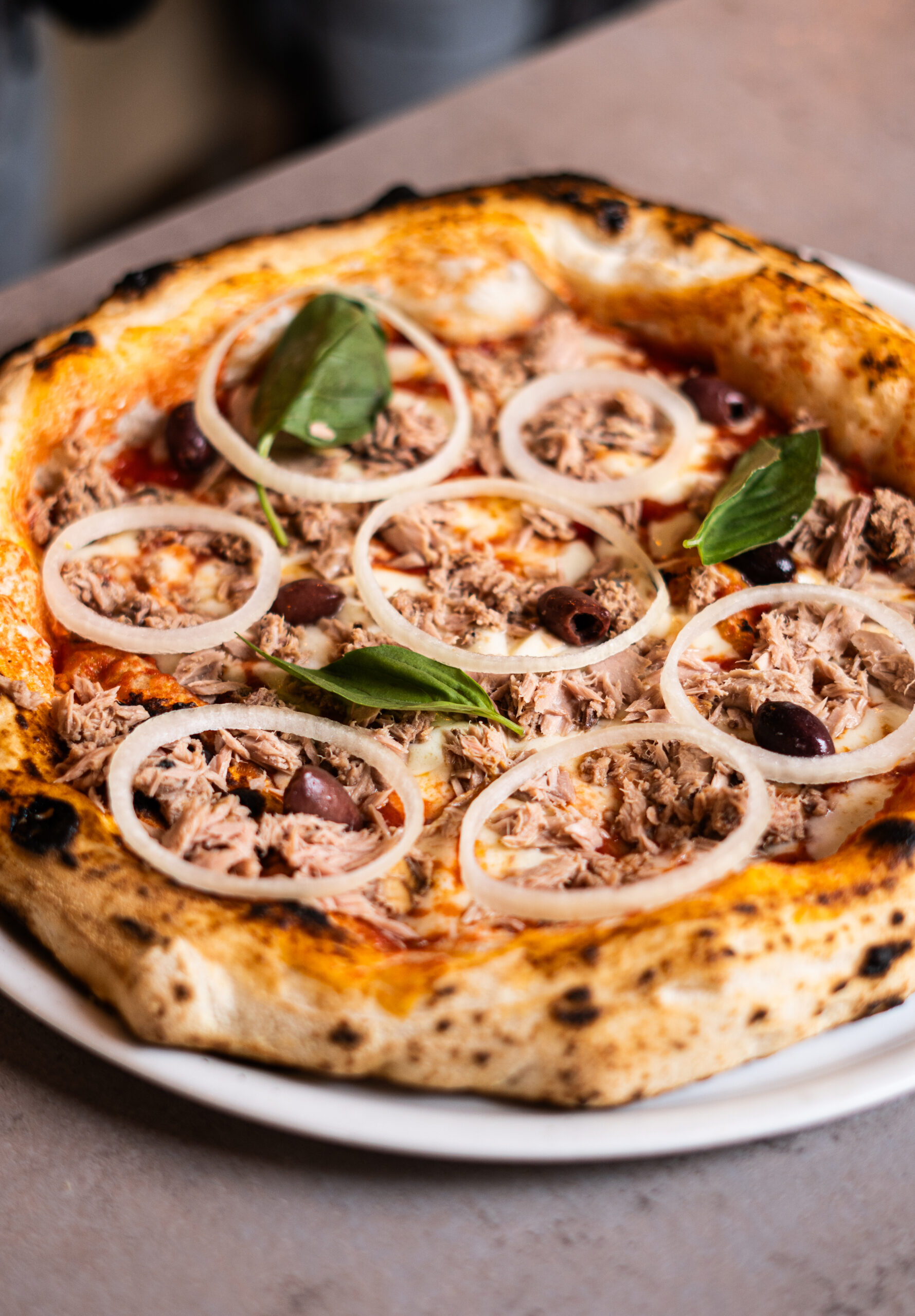 Sauce tomate, mozzarella fior di latte, thon, oignons rouges, olives noires,